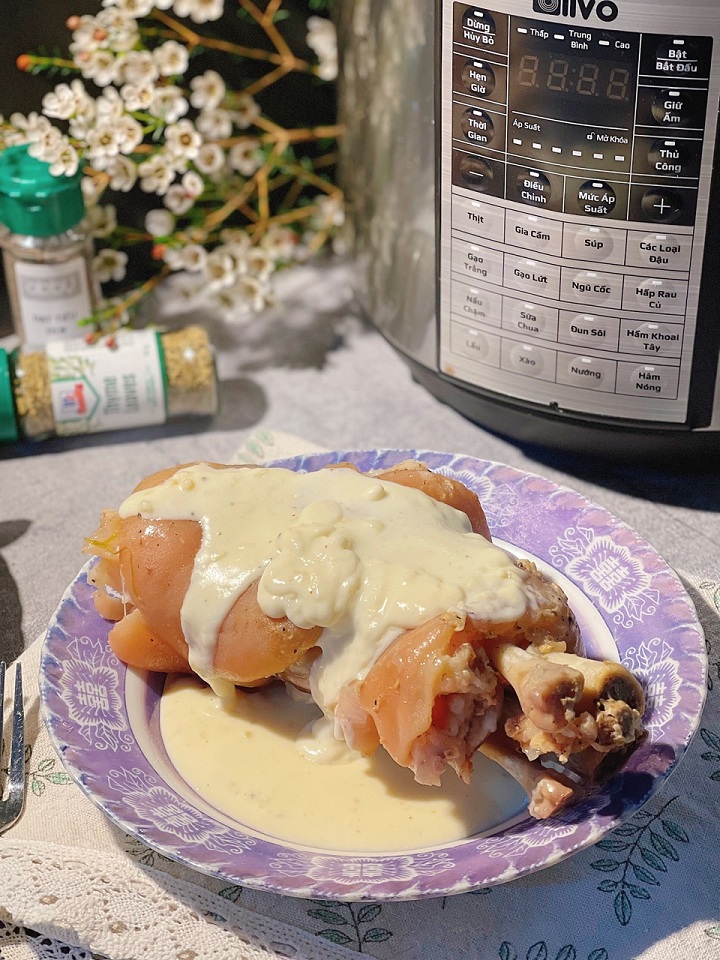 3. Chuẩn bị nồi áp suất,cho thịt chân giò, hành tây, tỏi tây, lá nguyệt quế vào nồi cùng với 200 ml sữa tươi, nước dùng xâm xấp mặt thịt.