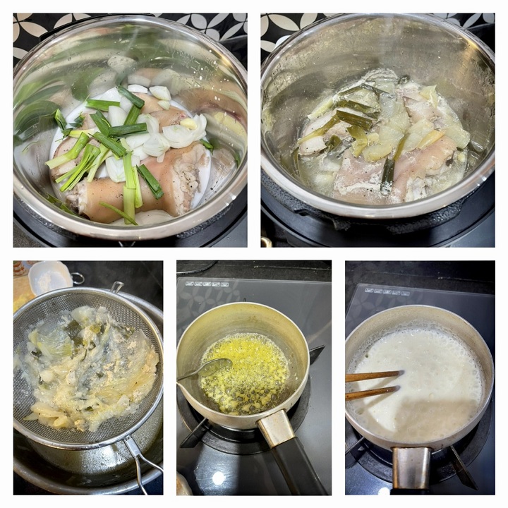 * Pha khoảng 1 bát con nước hầm chân giò cùng với sữa tươi, kem tươi. Từ từ cho hỗn hợp nước kem sữa này vào nồi. Vừa đổ vừa quấy nhanh tay và thật kỹ cho bột hoà quyện với nước. Sau khi đã cho hết, tiếp tục quấy đều, nấu trên lửa nhỏ để nước sốt sánh lại. Nêm nếm chút gia vị và hạt tiêu cho vừa miệng.