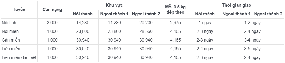 Bảng giá và thời gian giao hàng tham khảo của J&T Express: