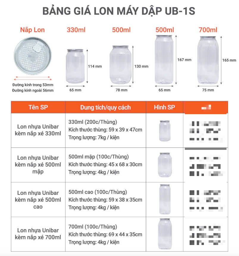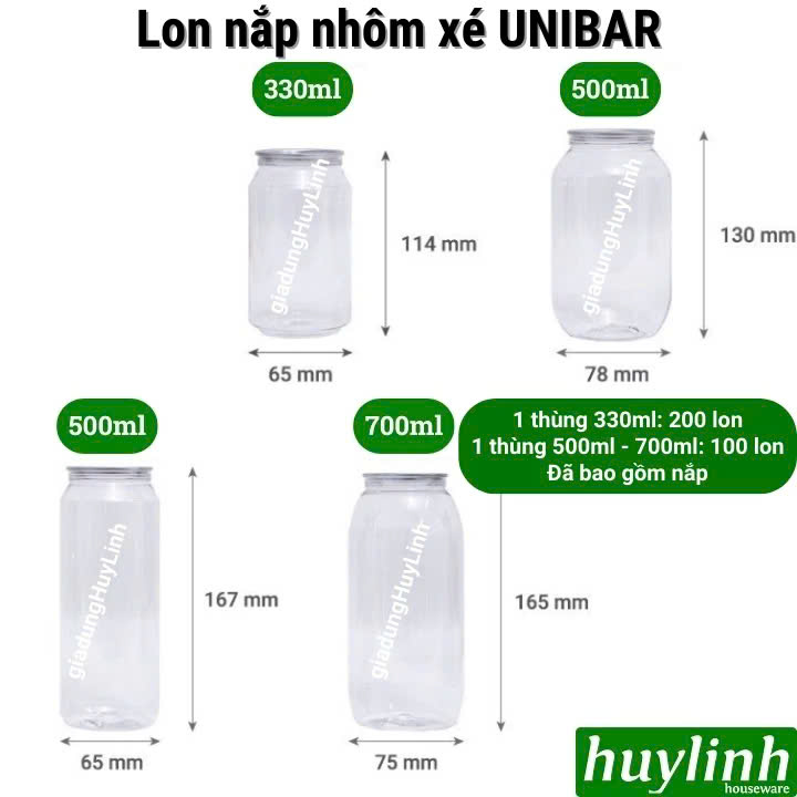 Lon nhựa PET nắp nhôm xé Unibar các size 330ml, 500ml, 700ml