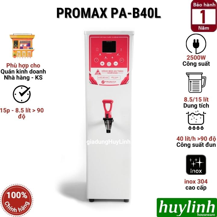- Promax PA-B40L có dung tích 10 lít – lấy nước thực tế 8.5 lít có hiệu suất đun 40 lít nước trên 90 độ trong 1 giờ - đạt hiệu suất lý tưởng giúp cửa hàng bạn luôn hoạt động liên tục trơn tru mà không sợ thiếu nước pha chế.