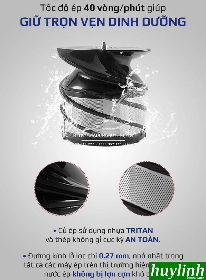 - Máy hoạt động chậm, không sinh nhiệt khi hoạt động nên đảm bảo giữ lượng dưỡng chất nguyên vẹn trong trái cây, rau củ sau khi ép