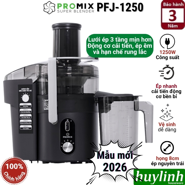 - Promix PFJ-1250 được trang bị động cơ công suất lớn 1250W giúp máy hoạt động ổn định, ép nhanh và khỏe hơn so với các dòng máy đời cũ.