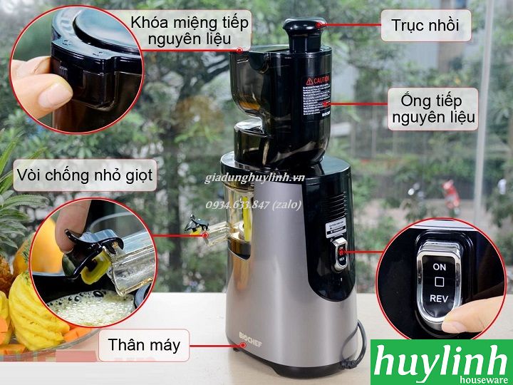 Máy ép trái cây Biochef 666 phù hợp cho cả gia đình và nhà hàng quán nước kinh doanh vừa và nhỏ, có công suất 250W, hoạt động êm với tốc độ rất chậm (40 vòng/phút) giúp nước ép sau khi nghiền không bị biến chất do nhiệt, giữ lại tối đa dưỡng chất vitamin, mà lại cho lượng nước ép nhiều hơn các dòng máy thông thường, bã sau khi ép rất kiệt nước.
