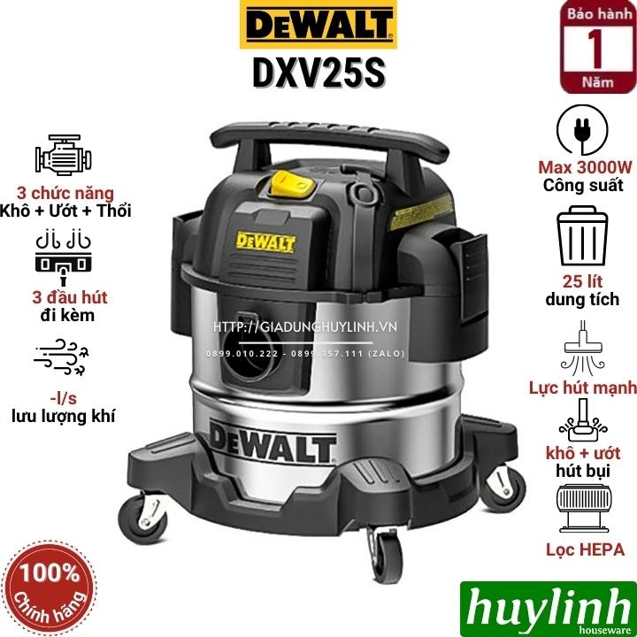 Dewalt USA DXV25S thùng chứa bằng INOX có công suất mạnh mẽ 2.980W (4HP), dung tích bình chứa lớn đến 25 lít (~6 gallon), Motor công nghiệp cực mạnh, siêu bền và hiệu quả cao.