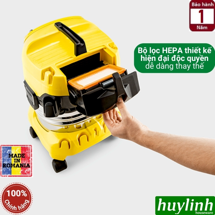- Máy hút bụi Karcher WD 4S được trang bị thùng chứa bằng thép 20 lít, ống hút dài 2,2m, bộ lọc xếp li phẳng và túi lọc bụi lông cừu.