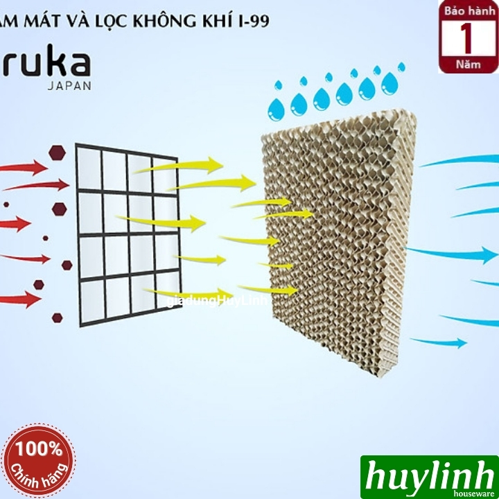 Iruka I-99 được thiết kế thêm hộp đá lạnh giúp mang lại hiệu quả cho không khí xung quanh được mát mẻ hơn. Quạt có dung tích bình chứa nước là17 lít nên sẽ có thể làm mát liên tục nhiều giờ mới phải châm thêm nước mới.