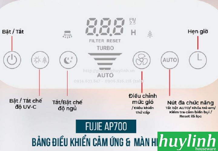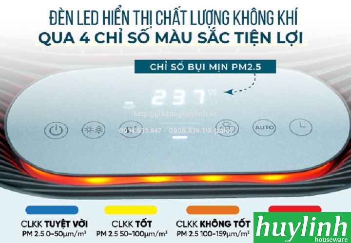 - Đèn hiển thị chất lượng không khí bằng chỉ số PM2.5/màu sắc chỉ thị.