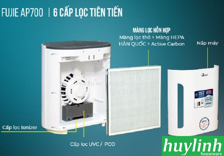 Máy lọc không khí Fujie AP700 có thiết kế với kiểu dáng Thuỵ sỹ sáng tạo, tích hợp tới 6 cấp lọc: 1. cấp lọc thô, 2. Cấp lọc Carbon than hoạt tính, 3 cấp lọc HEPA Hàn Quốc H13, 4. Cấp lọc tia cực tím UVC Lamp, 5. Cấp lọc Ionizer và 6. Cấp lọc PCO.