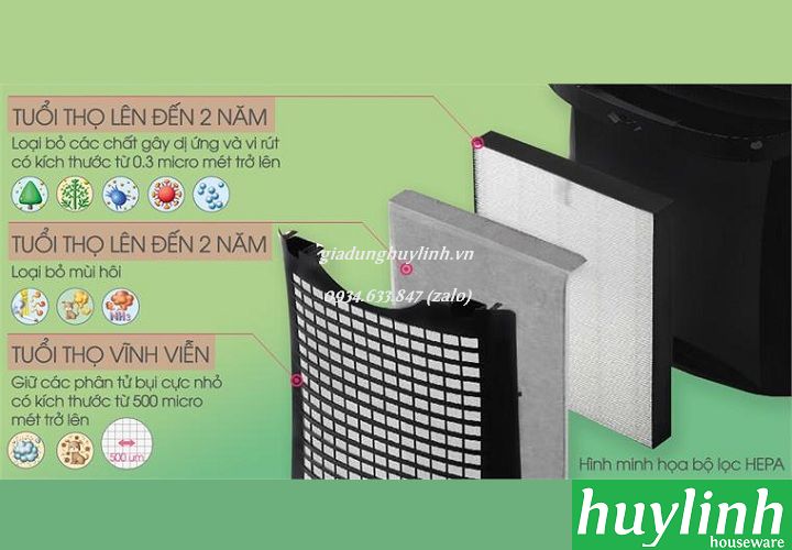 Lớp lọc loại bỏ các chất gây dị ứng và virus có kích thước từ 0.3 micron trở lên, có tuổi thọ lên đến 2 năm.