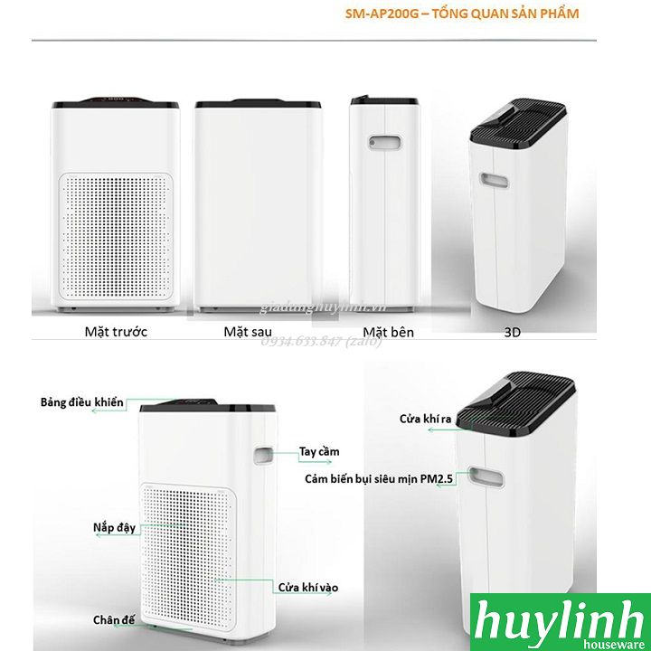 Shimono SM-AP200G có chức năng cảm biến bụi siêu mịn PM2.5, hiển thị màu sắc thể hiện chỉ số chất lượng không khí. Cùng với đó là công suất lọc 215m3/h giúp không gian xung quanh bạn luôn thoáng mát.