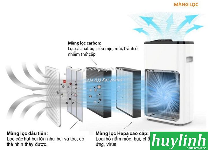 Chiếc máy lọc không khí này được trang bị màng lọc gồm màng lọc đầu tiên, màng lọc cacbon, màng lọc HEPA (H13). Màng lọc đầu tiên giúp lọc các hạt bụi lớn như bụi và tóc, các loại bụi có thể nhìn thấy được. Màng lọc carbon: Lọc các hạt bụi siêu mịn, mùi, tránh ô nhiễm thứ cấp. Màng lọc Hepa: Loại bỏ nấm mốc, chất gây dị ứng, bụi, virus.