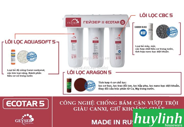 Máy lọc nước Geyser Ecotar 5 sử dụng vật liệu CBC 5 và vật liệu Aragon 5 của Geyser LB Nga tác dụng loại bỏ các rong rêu, tảo, nấm, gỉ sét từ đường ống; loại bỏ kim loại nặng, chất độc hại, chất hóa học, thuốc trừ sâu, chất phóng xạ tồn dư trong nước; loại bỏ màu, mùi, … giúp làm sạch nước hiệu quả.