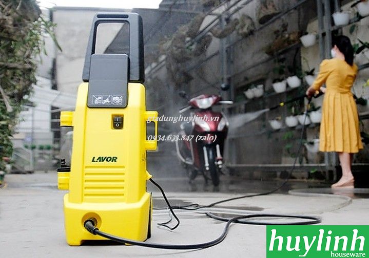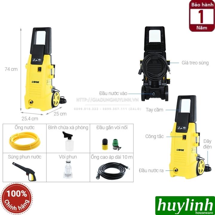- Phụ kiện : Gồm 1 súng phun + 1 ống nối dài, 2 đầu phun (1 đầu phun dạng tia có thể thay đổi thay đổi từ tia phun thẳng tập trung vào 1 điểm thành tia phun xoè, 1 đầu turbo phun dạng toả), dây phun cao áp mới dài : 10m, 1 bàn chải, 1 đầu phun tạo bọt. Máy có bổ sung thêm bộ phận lọc cho tất cả các máy xịt rửa (Transparent Filter). Dây nối từ vòi nước vào máy chính hãng Lavor dài 3M. Chú ý dùng vòi nước để lấy nước từ nguồn nước thấp vào máy xịt rửa nên có chiều dài tối đa 2.5-3m.