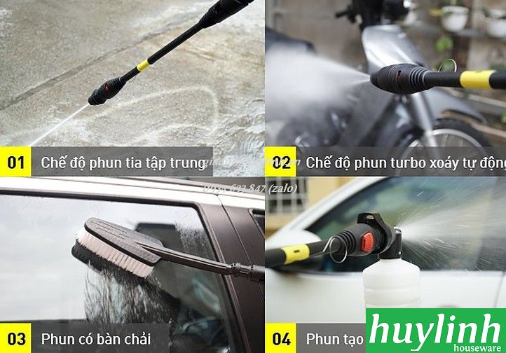 - Rửa xe máy, rửa ôtô làm sạch nhanh chóng, phun xịt gầm xe, nóc xe cách dễ dàng.