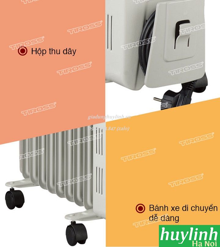 Máy sưởi dầu tiross 9 thanh TS-923 có chân đế bánh xe, chắc chắn và dễ di chuyển đến các vị trí khác nhau trong phòng