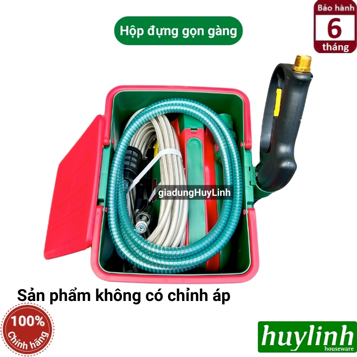 Phụ kiện : 1 thùng đựng máy có ống gài súng, 1 súng, 1 dây xịt 10m, 1 ống hút nước, 1 nối nhanh nhựa 1 lọc rác ,1 bình bọt xà bông