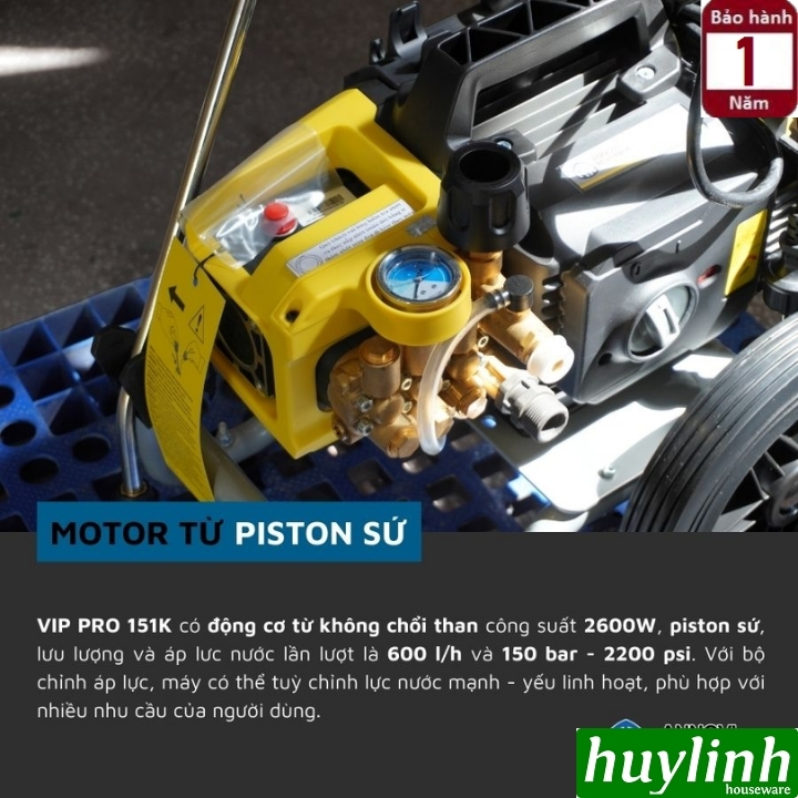 - Công suất 2600W tạo áp lực nước mạnh mẽ lên đến 150 bar (2200 PSI), dễ dàng đánh bay bùn đất, dầu mỡ và các mảng bám cứng đầu.