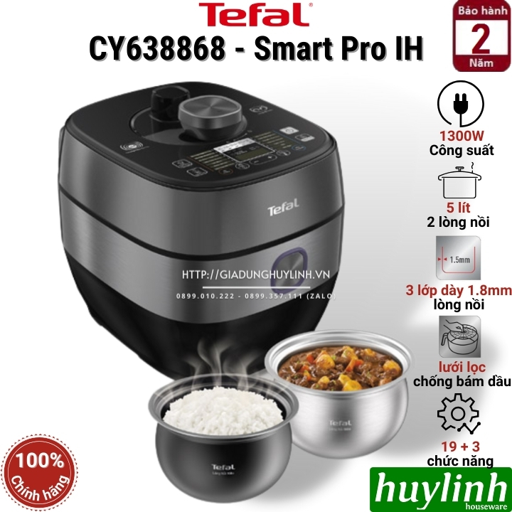 - Nồi áp suất điện Tefal Smart Pro CY638868 gồm các phụ kiện sau: 2 lòng nồi để nấu nhiều món khác nhau: 1 lòng nồi inox và 1 lòng nồi nhôm chống dính; muỗng canh; muỗng cơm; xửng hấp; ca đong.