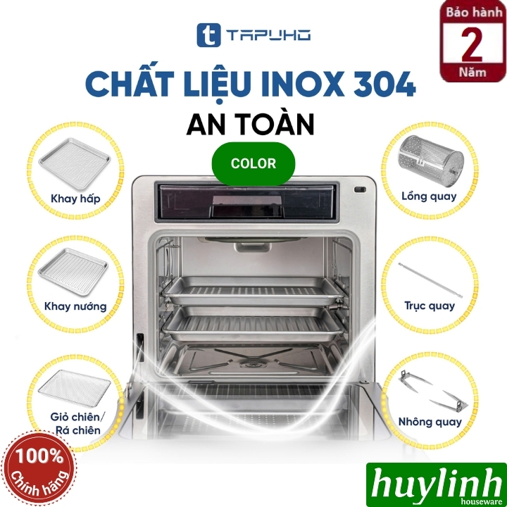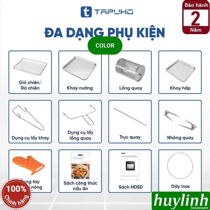 - Phụ kiện: Nhông quay; lồng quay; khay hấp; khay nướng; dụng cụ lấy khay; dụng cụ lấy lồng quay; sách công thức; sách hướng dẫn.