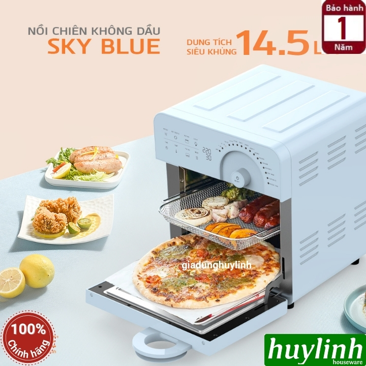 - Dung tích 14.5 lít siêu khủng có thể nướng chiên gà nguyên con, 20 cánh gà 1 lúc, 20cm pizza hay 800gr khoai tây