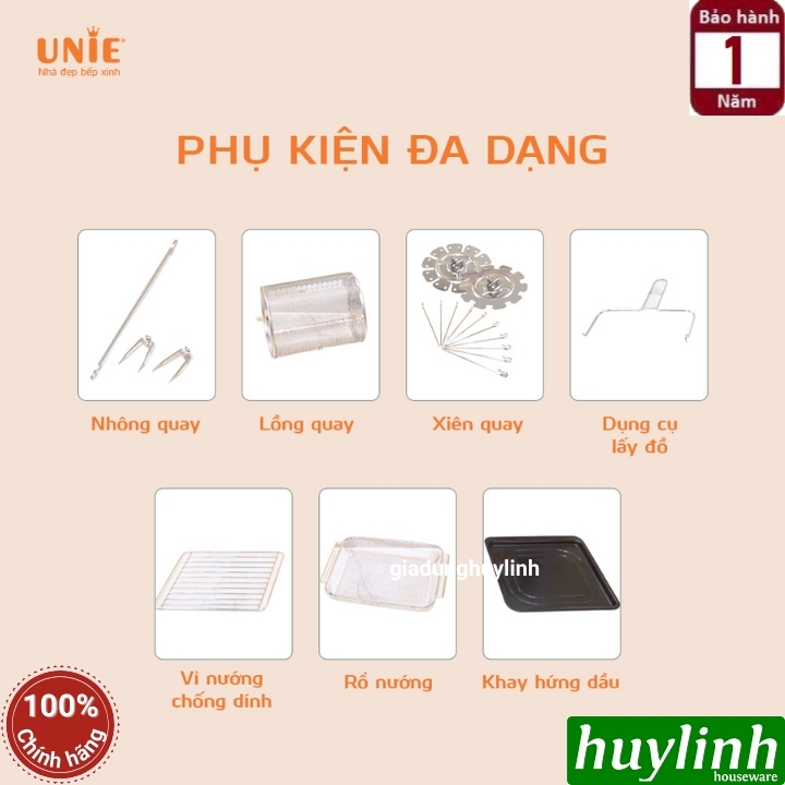 - Phụ kiện: Xiên quay, Giỏ/lồng quay, Nhông quay, dụng cụ lấy đồ, Vỉ nướng chống dính (2 vỉ), Khay hứng đồ ăn/dầu ăn, tấm lưới chắn dầu