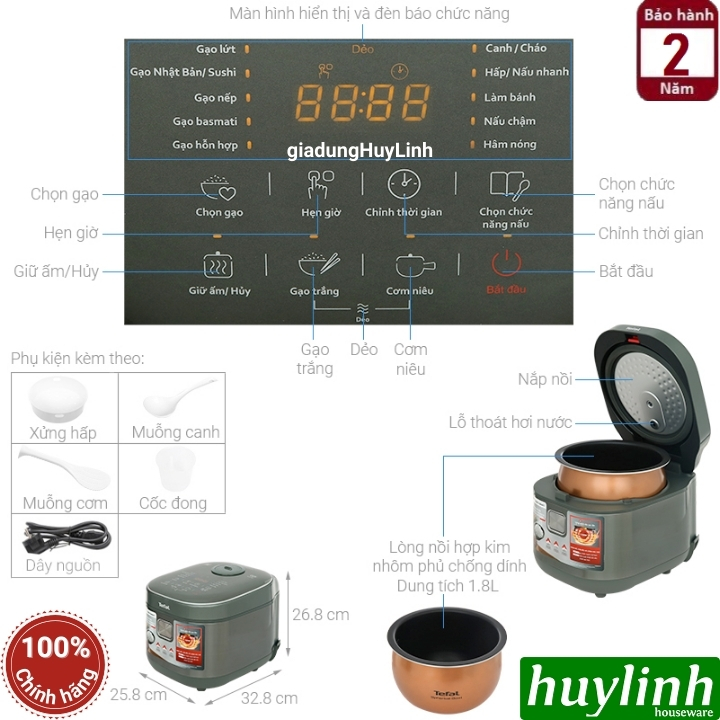 - Tiện ích: Cảm biến nhiệt kép tự động điều chỉnh thời gian và nhiệt độ; Có xửng hấp; Hẹn giờ 24 giờ; Giữ ấm 12 giờ