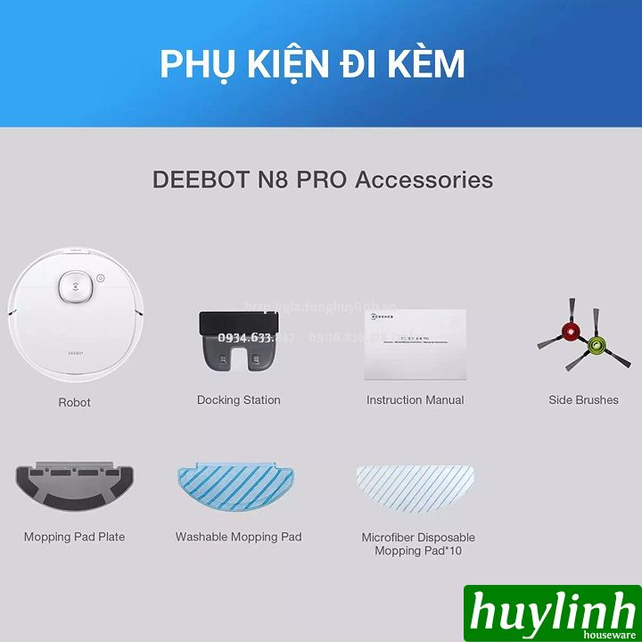 - Phụ kiện: Tấm lau (dùng nhiều lần) 1; Dock sạc 1; Ngăn đựng nước 1; Dụng cụ vệ sinh robot 1; Chổi quét ven 4; Bộ lọc hiệu suất cao 1; Sách HDSD Có; Dây nguồn Dock sạc