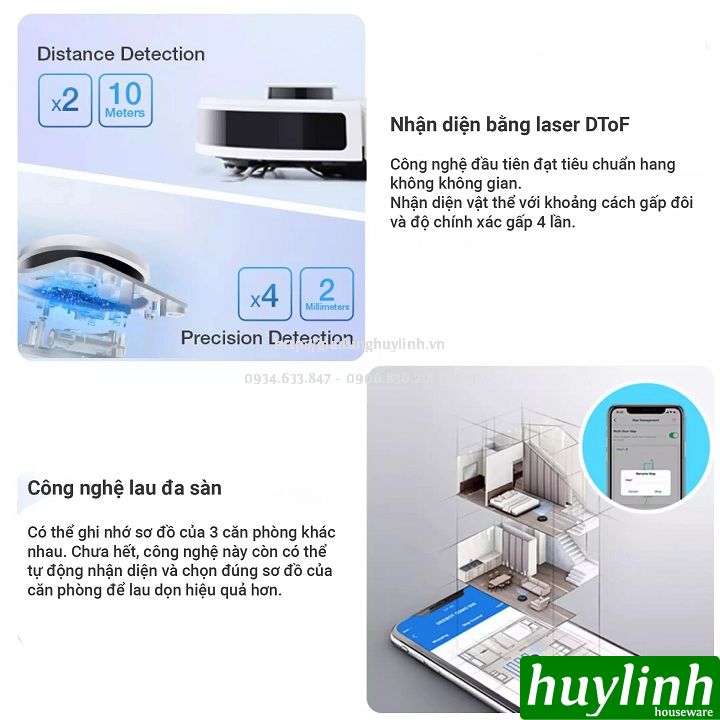 - Công nghệ lau đa sàn: Ghi nhớ sơ đồ của 3 phòng khác nhau, tự động nhận diện và chọn đúng sơ đồ căn phòng để lau dọn hiệu quả.