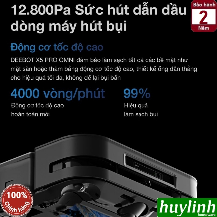 - Sức hút vượt trội 12.800Pa của Deebot X5 Pro Omni dễ dàng loại bỏ bụi mịn, tóc, vụn bánh và các vết bẩn cứng đầu trên sàn gỗ, gạch men hay thảm.
