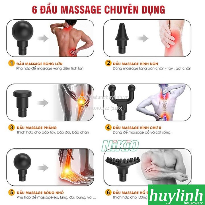 - Súng massage gun Nikio NK-170B có 6 đầu massage đi kèm. Mỗi đầu được nghiên cứu thiết kế dựa trên cấu tạo cơ bắp ở từng vị trí riêng biệt để có thể tác động chính xác và mang đến hiệu quả massage tốt nhất cho người dùng.
