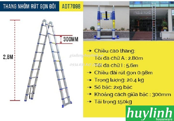 Thang nhôm rút gọn chữ A Advindeq ADT709B là loại thang rút đa năng có thể dựng chữ A cho người sử dụng đứng mà không cần có điểm dựa vào, ngoài ra thang còn có thể dựng đứng lên chữ I với chiều cao gấp đôi so với chữ A.