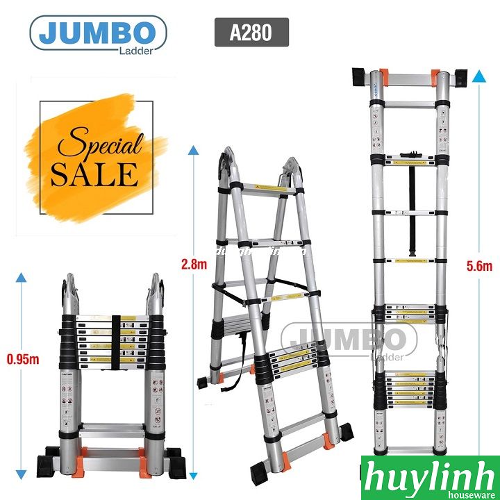 Thân thang nhôm rút đôi chữ A JUMBO – A 280 được làm bằng chất liệu nhôm siêu bền bỉ,siêu bóng sáng, đạt tiêu chuẩn Châu Âu, chịu lực chịu nhiệt tốt, không bị bong tróc hay mục rữa do tác động thời tiết, có thể đỡ được trọng tải lên đến 300kg.
