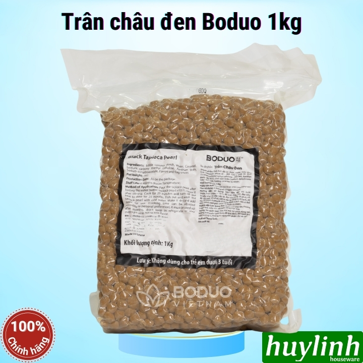 Hạt trân châu đen chế biến thành phẩm được đóng gói dạng túi 1kg, sản xuất chính hãng bởi Công ty CN sinh học Qiyiniao Chiết Giang, Trung Quốc.