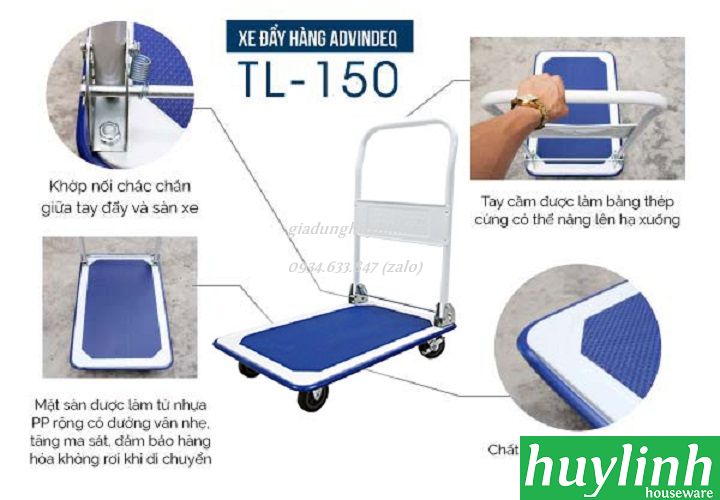 Xe đẩy hàng ADVINDEQ TL-150 có tải trọng 170kg - 200kg được thiết kế nhỏ gọn tay đẩy có thể gấp gọn khi không sử dụng. Sản phẩm thích hợp sử dụng trong nhà kho, xưởng sản xuất, kho hàng, siêu thị, nhà sách...